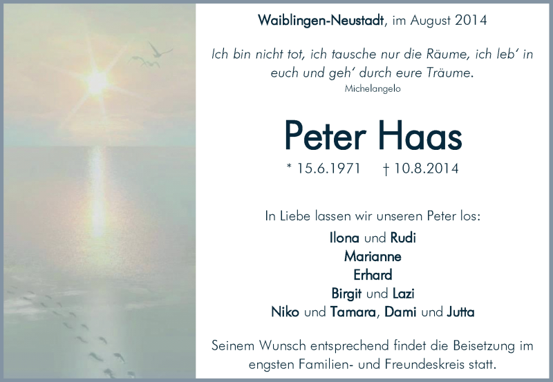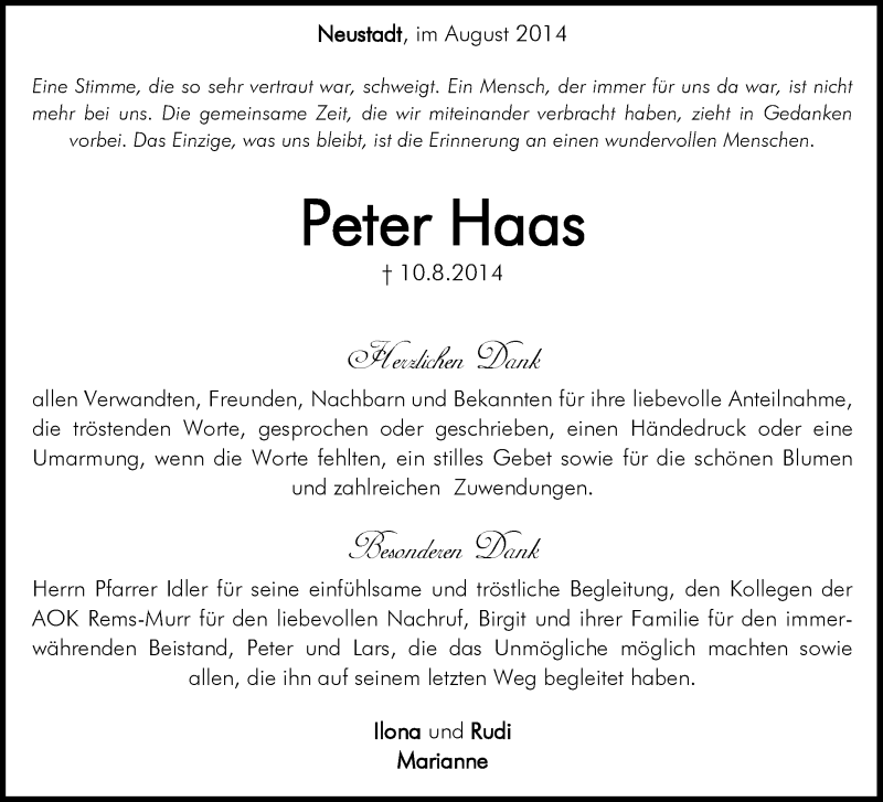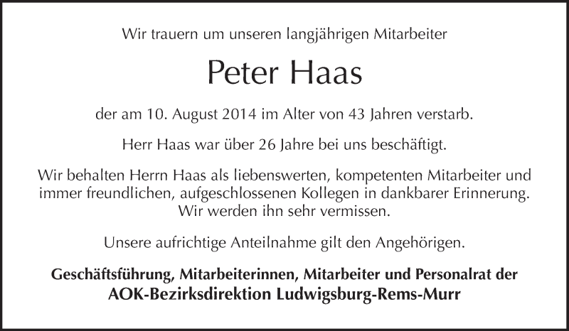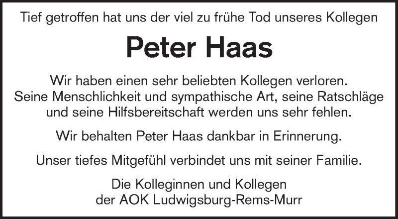 Hier finden Sie alle Traueranzeigen aus der Zeitung, die bisher für Peter Haas erschienen sind. Weitere Traueranzeigen, die in der Zeitung erscheinen, werden hier ebenfalls aufgelistet