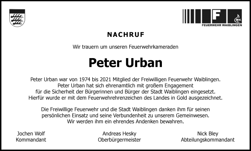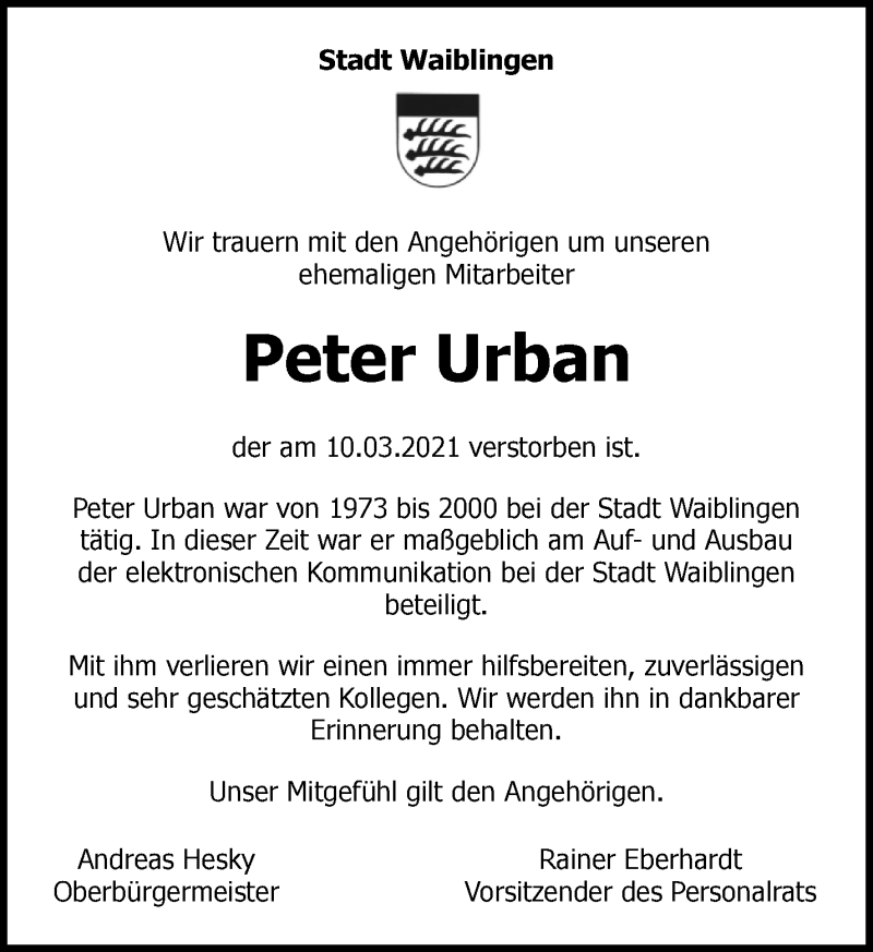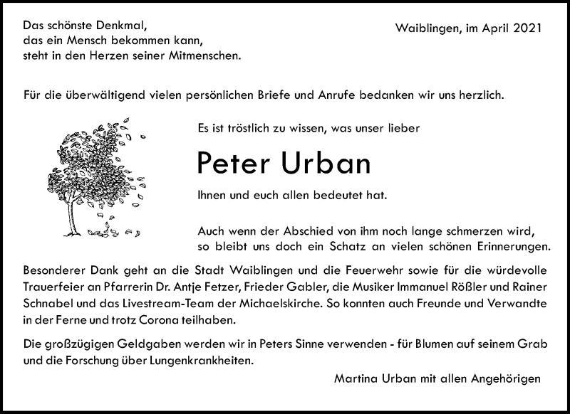 Hier finden Sie alle Traueranzeigen aus der Zeitung, die bisher für Peter Urban erschienen sind. Weitere Traueranzeigen, die in der Zeitung erscheinen, werden hier ebenfalls aufgelistet