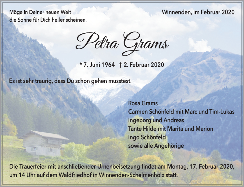 Hier finden Sie alle Traueranzeigen aus der Zeitung, die bisher für Petra Grams erschienen sind. Weitere Traueranzeigen, die in der Zeitung erscheinen, werden hier ebenfalls aufgelistet