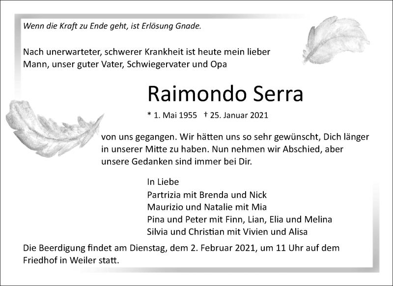Hier finden Sie alle Traueranzeigen aus der Zeitung, die bisher für Raimondo Serra erschienen sind. Weitere Traueranzeigen, die in der Zeitung erscheinen, werden hier ebenfalls aufgelistet