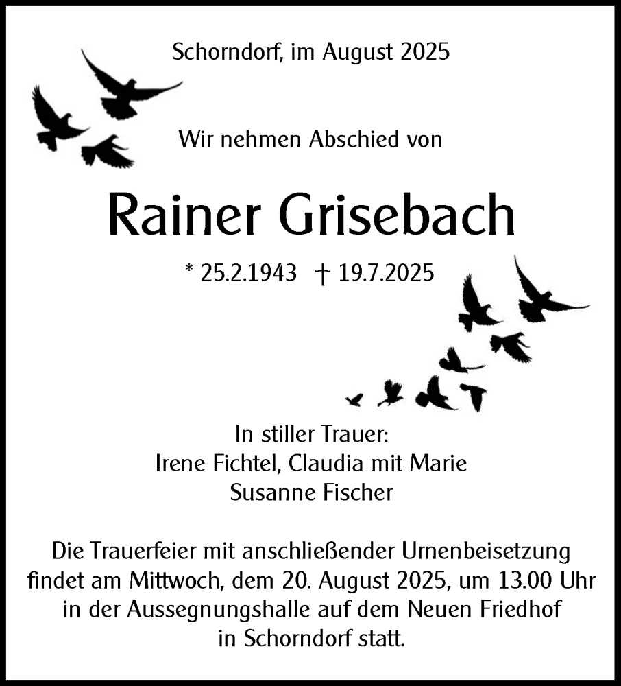 Hier finden Sie alle Traueranzeigen aus der Zeitung, die bisher für Rainer Grisebach erschienen sind. Weitere Traueranzeigen, die in der Zeitung erscheinen, werden hier ebenfalls aufgelistet