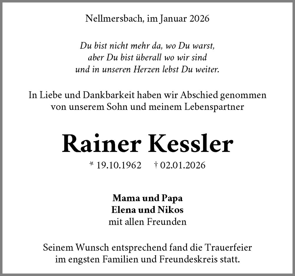 Hier finden Sie alle Traueranzeigen aus der Zeitung, die bisher für Rainer Kessler erschienen sind. Weitere Traueranzeigen, die in der Zeitung erscheinen, werden hier ebenfalls aufgelistet
