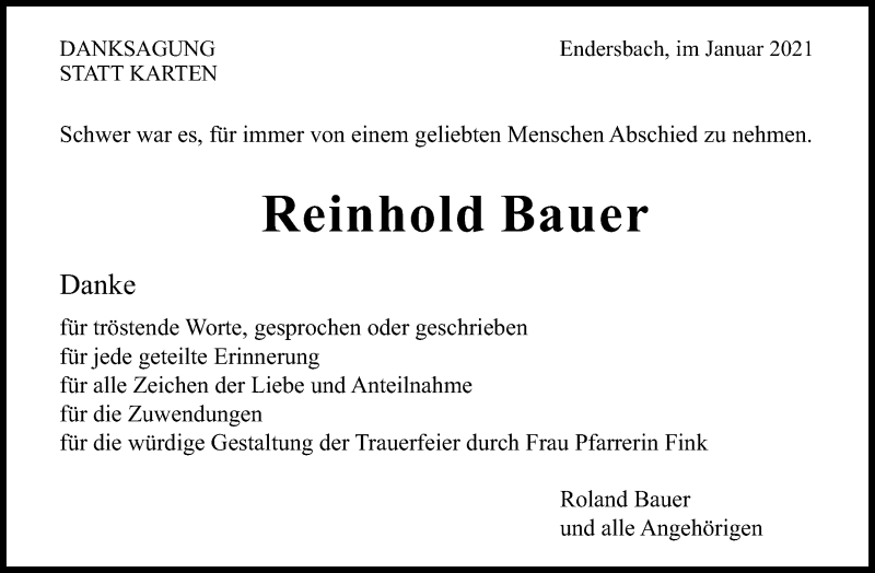 Hier finden Sie alle Traueranzeigen aus der Zeitung, die bisher für Reinhold Bauer erschienen sind. Weitere Traueranzeigen, die in der Zeitung erscheinen, werden hier ebenfalls aufgelistet