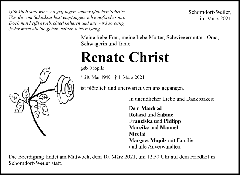 Hier finden Sie alle Traueranzeigen aus der Zeitung, die bisher für Renate Christ erschienen sind. Weitere Traueranzeigen, die in der Zeitung erscheinen, werden hier ebenfalls aufgelistet