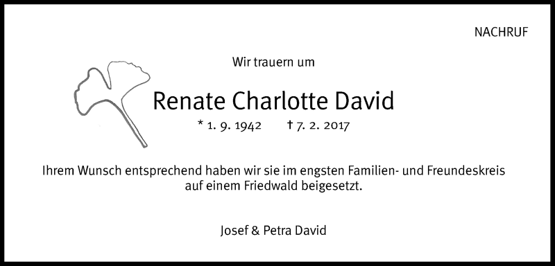 Hier finden Sie alle Traueranzeigen aus der Zeitung, die bisher für Renate Charlotte David erschienen sind. Weitere Traueranzeigen, die in der Zeitung erscheinen, werden hier ebenfalls aufgelistet