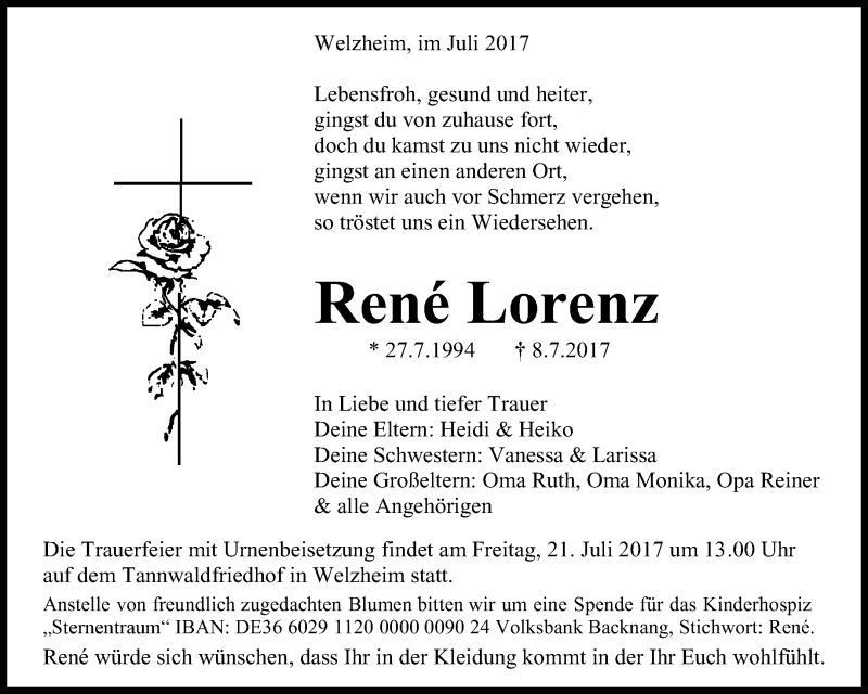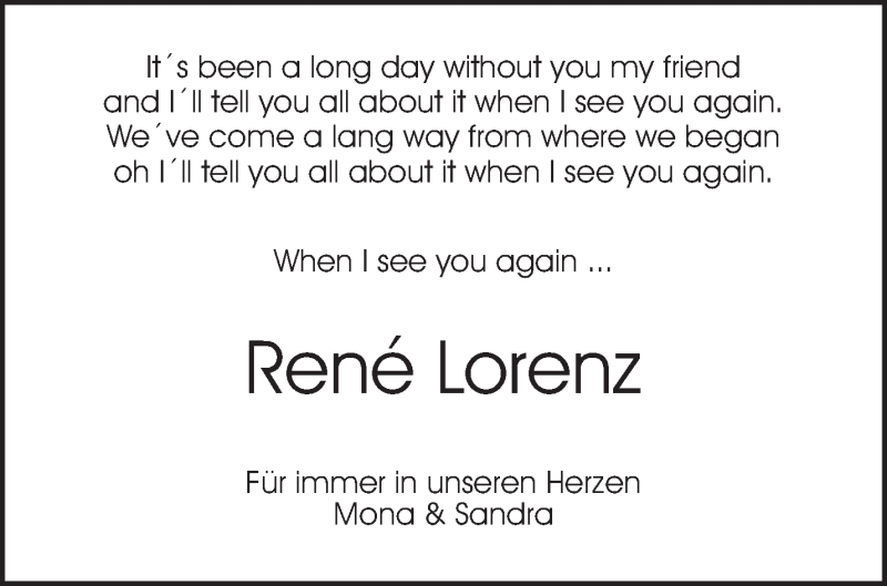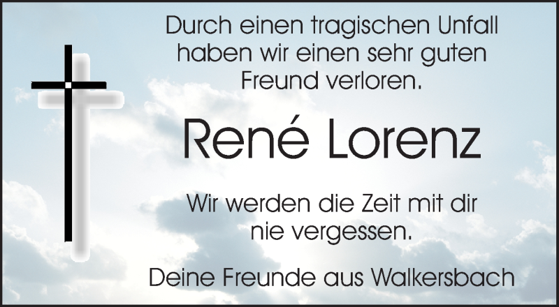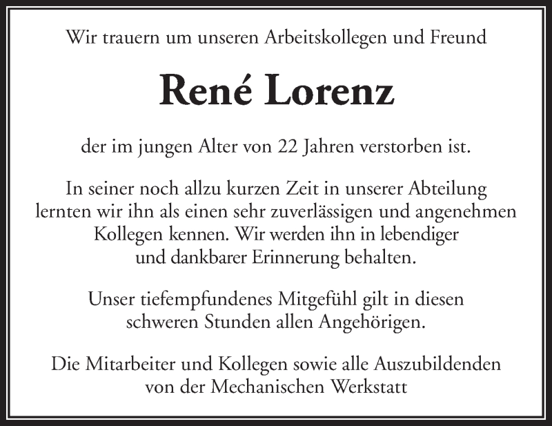 Hier finden Sie alle Traueranzeigen aus der Zeitung, die bisher für Rene Lorenz erschienen sind. Weitere Traueranzeigen, die in der Zeitung erscheinen, werden hier ebenfalls aufgelistet