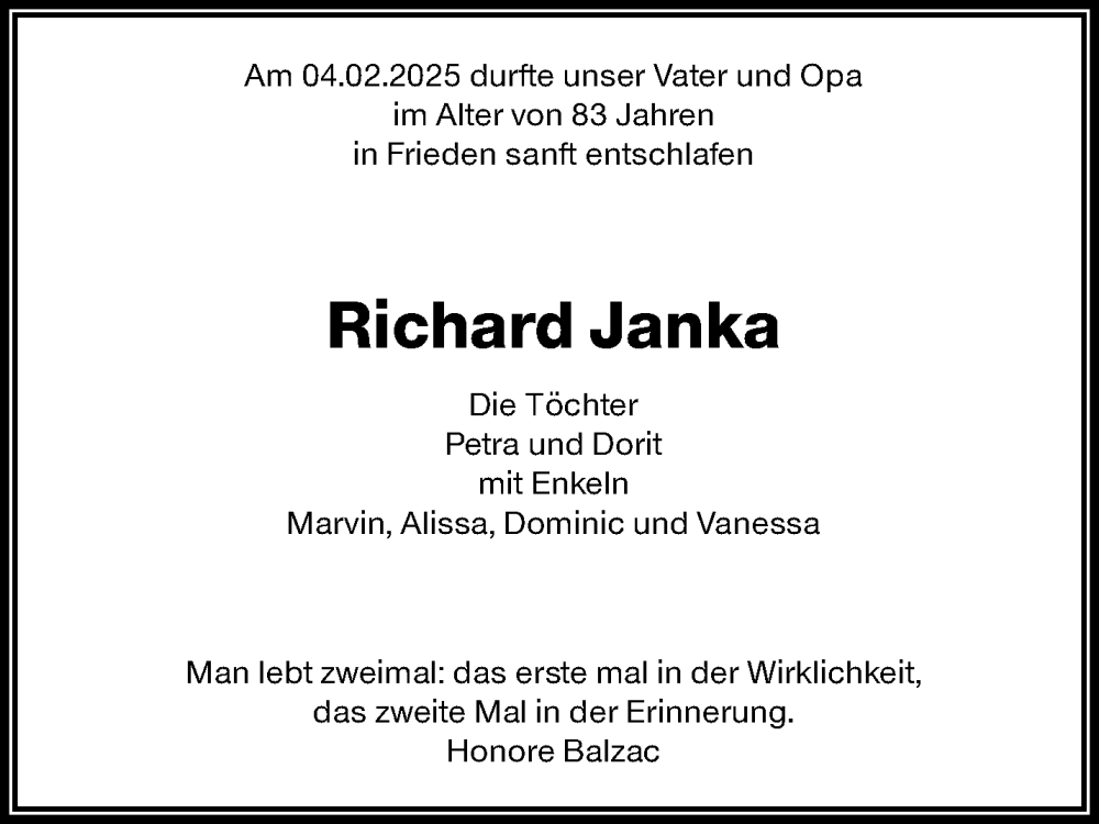 Hier finden Sie alle Traueranzeigen aus der Zeitung, die bisher für Richard Janka erschienen sind. Weitere Traueranzeigen, die in der Zeitung erscheinen, werden hier ebenfalls aufgelistet