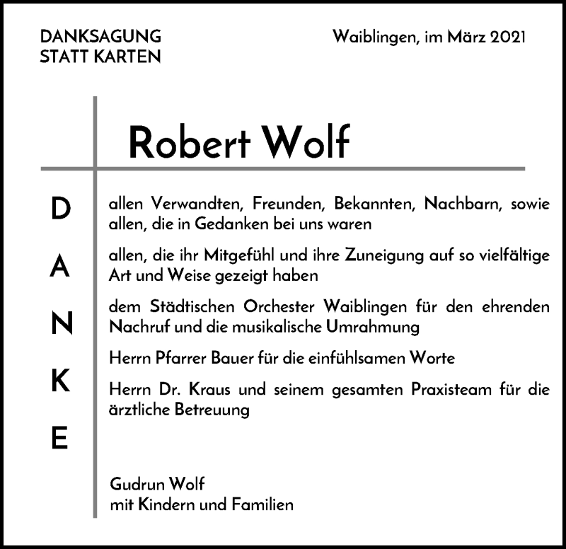 Hier finden Sie alle Traueranzeigen aus der Zeitung, die bisher für Robert Wolf erschienen sind. Weitere Traueranzeigen, die in der Zeitung erscheinen, werden hier ebenfalls aufgelistet