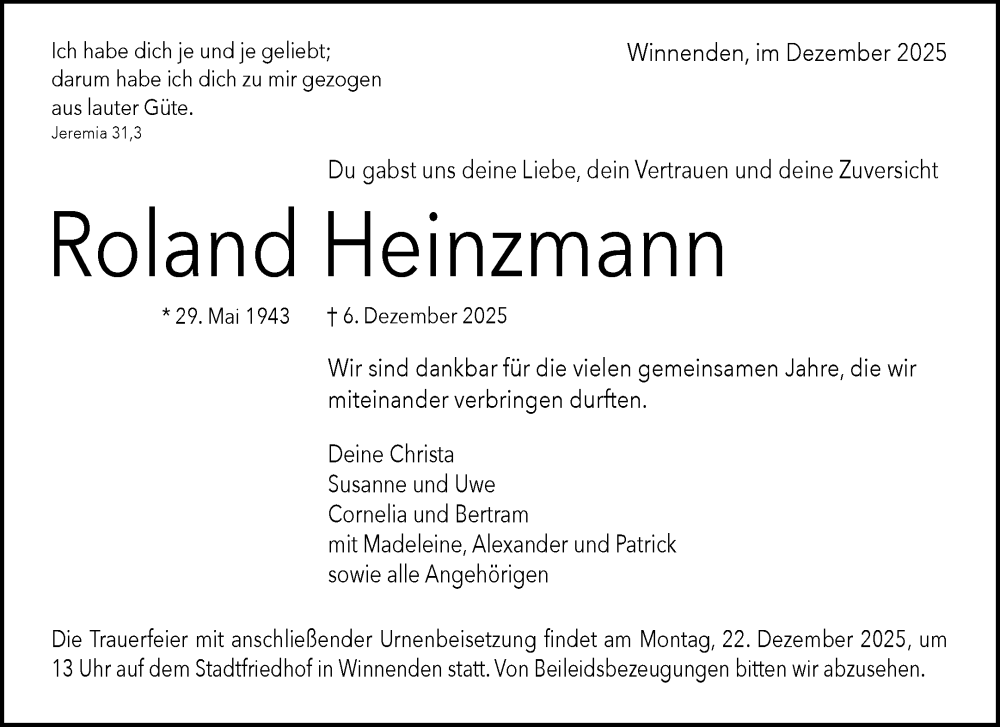 Hier finden Sie alle Traueranzeigen aus der Zeitung, die bisher für Roland Heinzmann erschienen sind. Weitere Traueranzeigen, die in der Zeitung erscheinen, werden hier ebenfalls aufgelistet