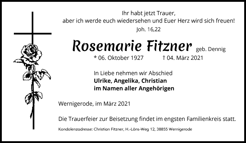 Hier finden Sie alle Traueranzeigen aus der Zeitung, die bisher für Rosemarie Fitzner erschienen sind. Weitere Traueranzeigen, die in der Zeitung erscheinen, werden hier ebenfalls aufgelistet