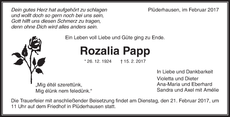 Hier finden Sie alle Traueranzeigen aus der Zeitung, die bisher für Rozalia Papp erschienen sind. Weitere Traueranzeigen, die in der Zeitung erscheinen, werden hier ebenfalls aufgelistet