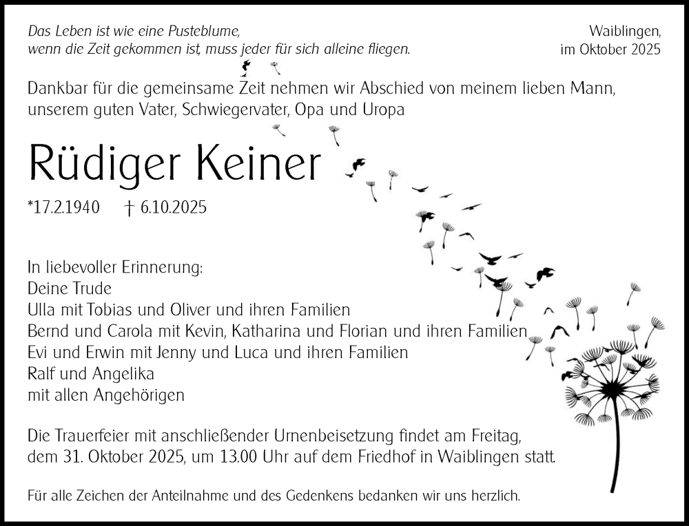 Hier finden Sie alle Traueranzeigen aus der Zeitung, die bisher für Rüdiger Keiner erschienen sind. Weitere Traueranzeigen, die in der Zeitung erscheinen, werden hier ebenfalls aufgelistet