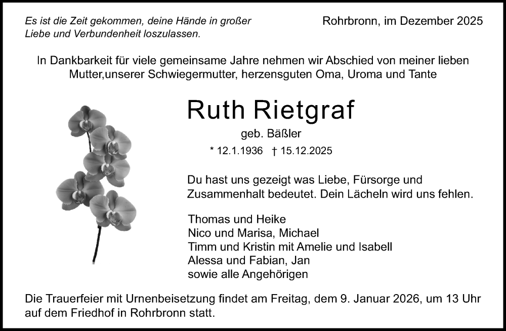 Hier finden Sie alle Traueranzeigen aus der Zeitung, die bisher für Ruth Rietgraf erschienen sind. Weitere Traueranzeigen, die in der Zeitung erscheinen, werden hier ebenfalls aufgelistet