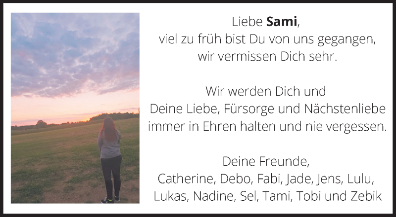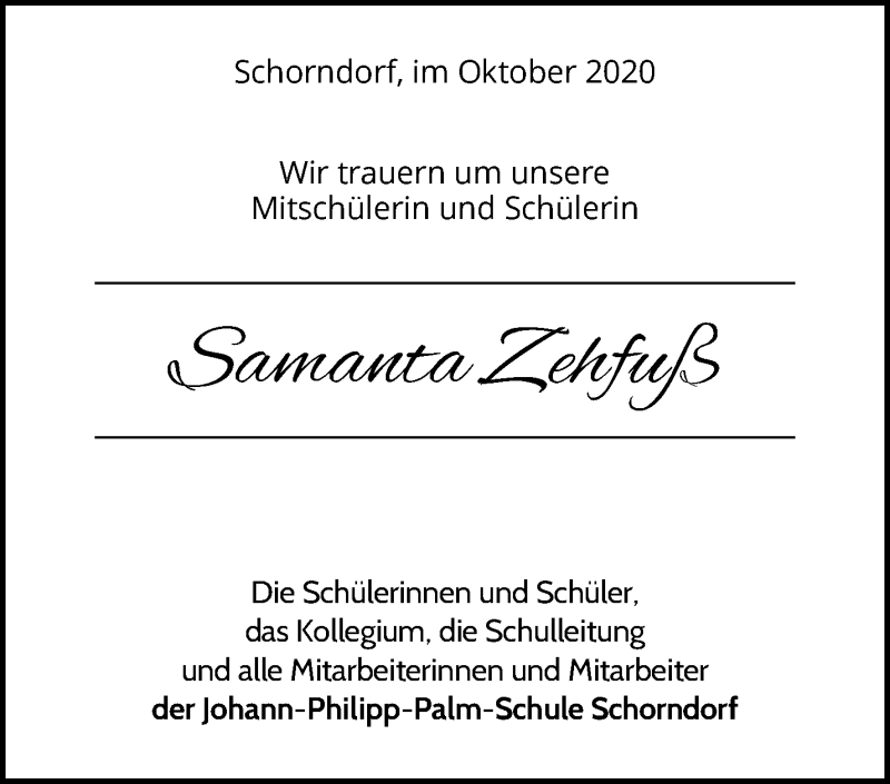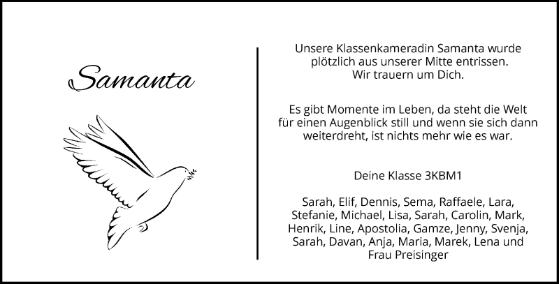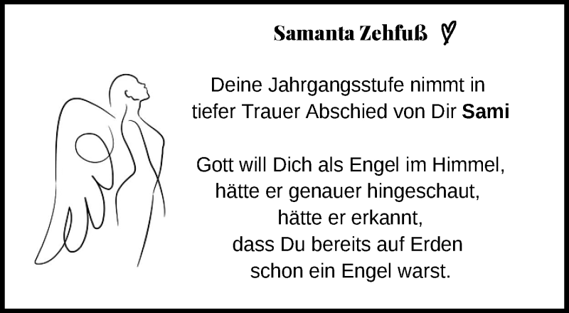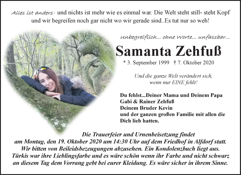Hier finden Sie alle Traueranzeigen aus der Zeitung, die bisher für Samanta Zehfuß erschienen sind. Weitere Traueranzeigen, die in der Zeitung erscheinen, werden hier ebenfalls aufgelistet