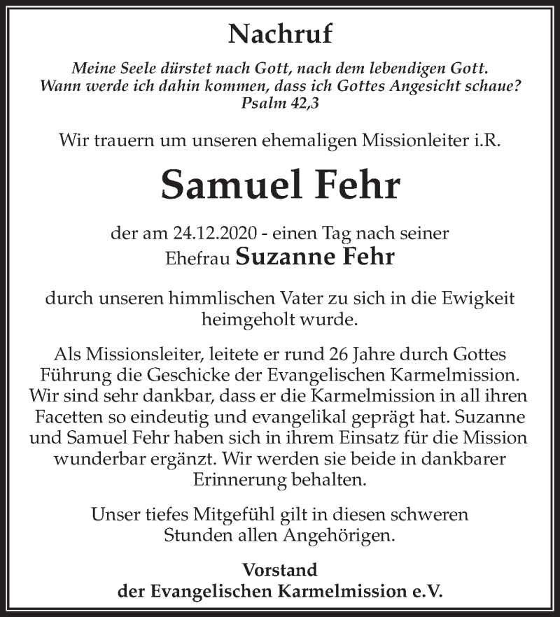 Hier finden Sie alle Traueranzeigen aus der Zeitung, die bisher für Samuel Fehr erschienen sind. Weitere Traueranzeigen, die in der Zeitung erscheinen, werden hier ebenfalls aufgelistet