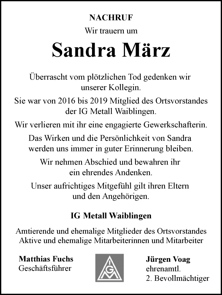 Hier finden Sie alle Traueranzeigen aus der Zeitung, die bisher für Sandra März erschienen sind. Weitere Traueranzeigen, die in der Zeitung erscheinen, werden hier ebenfalls aufgelistet