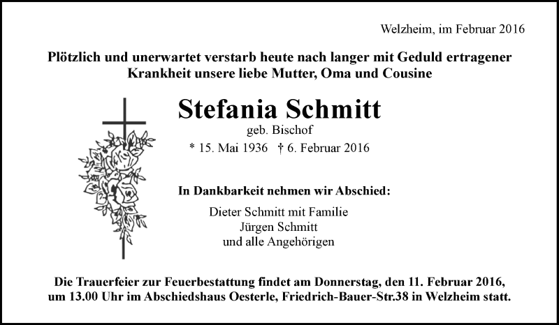 Hier finden Sie alle Traueranzeigen aus der Zeitung, die bisher für Stefania Schmitt erschienen sind. Weitere Traueranzeigen, die in der Zeitung erscheinen, werden hier ebenfalls aufgelistet