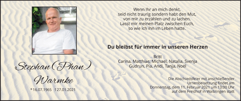 Hier finden Sie alle Traueranzeigen aus der Zeitung, die bisher für Stephan Warmke erschienen sind. Weitere Traueranzeigen, die in der Zeitung erscheinen, werden hier ebenfalls aufgelistet