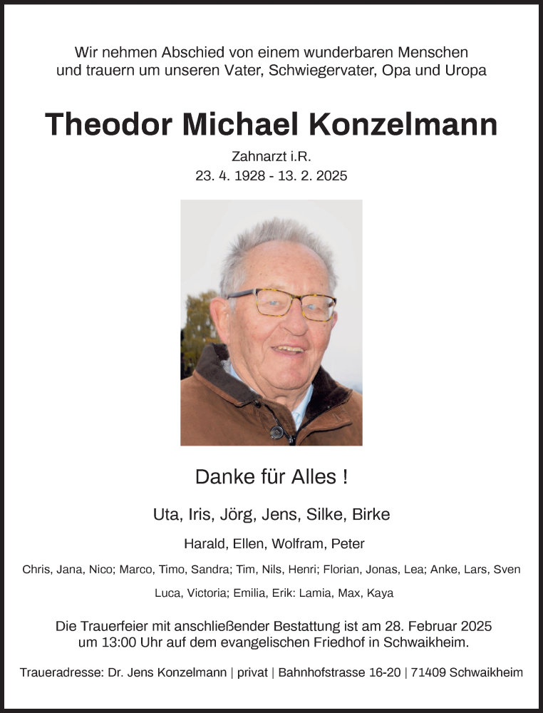 Hier finden Sie alle Traueranzeigen aus der Zeitung, die bisher für Theodor Michael Konzelmann erschienen sind. Weitere Traueranzeigen, die in der Zeitung erscheinen, werden hier ebenfalls aufgelistet