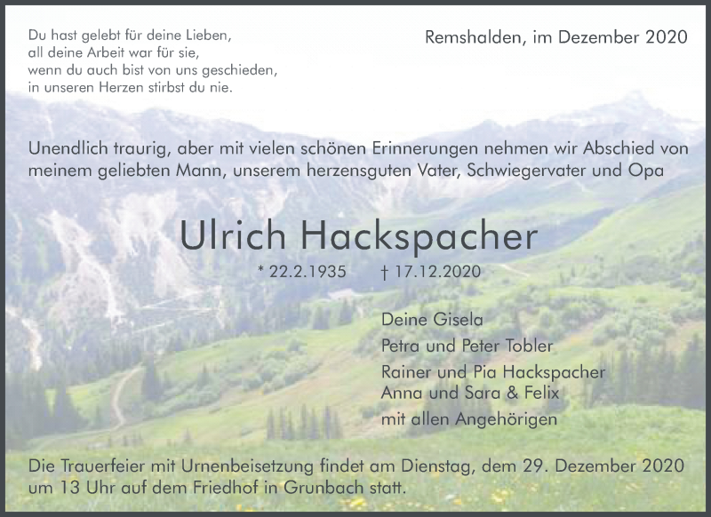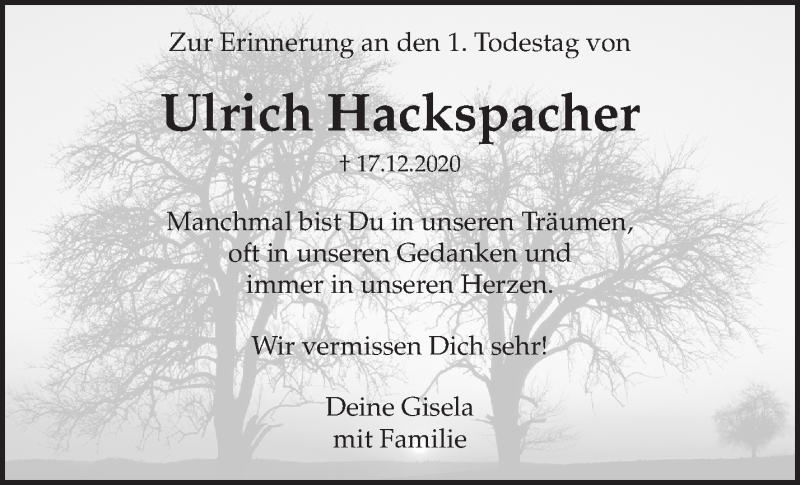 Hier finden Sie alle Traueranzeigen aus der Zeitung, die bisher für Ulrich Hackspacher erschienen sind. Weitere Traueranzeigen, die in der Zeitung erscheinen, werden hier ebenfalls aufgelistet