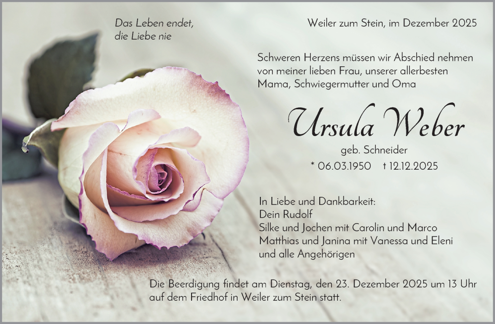 Hier finden Sie alle Traueranzeigen aus der Zeitung, die bisher für Ursula Weber erschienen sind. Weitere Traueranzeigen, die in der Zeitung erscheinen, werden hier ebenfalls aufgelistet