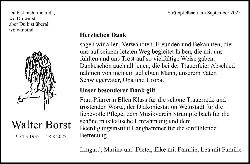 Hier finden Sie alle Traueranzeigen aus der Zeitung, die bisher für Walter Borst erschienen sind. Weitere Traueranzeigen, die in der Zeitung erscheinen, werden hier ebenfalls aufgelistet