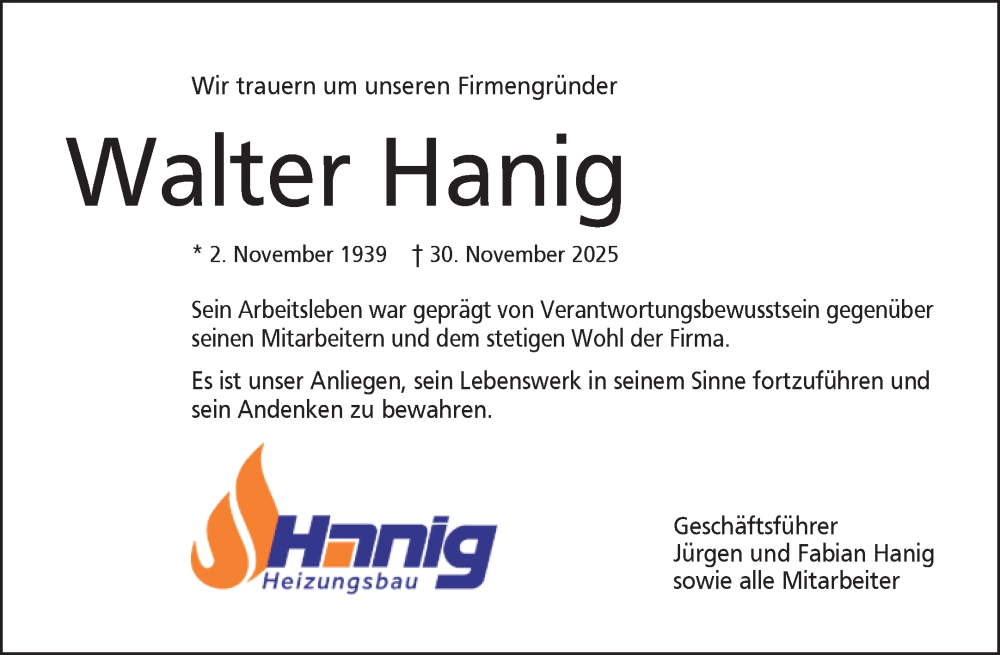 Hier finden Sie alle Traueranzeigen aus der Zeitung, die bisher für Walter Hanig erschienen sind. Weitere Traueranzeigen, die in der Zeitung erscheinen, werden hier ebenfalls aufgelistet