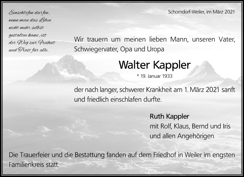 Hier finden Sie alle Traueranzeigen aus der Zeitung, die bisher für Walter Kappler erschienen sind. Weitere Traueranzeigen, die in der Zeitung erscheinen, werden hier ebenfalls aufgelistet