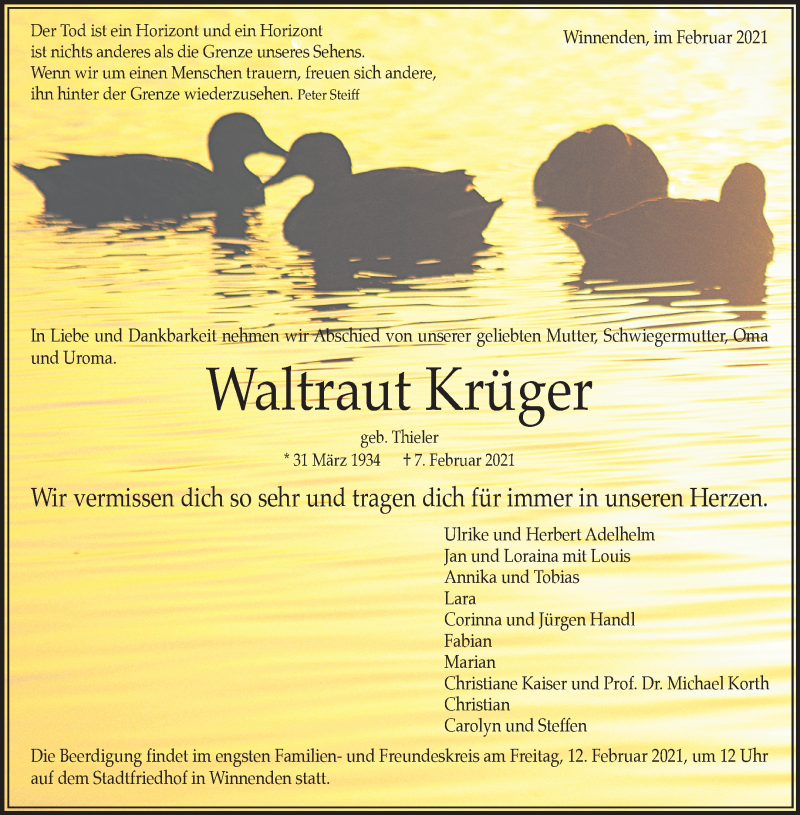 Hier finden Sie alle Traueranzeigen aus der Zeitung, die bisher für Waltraut Krüger erschienen sind. Weitere Traueranzeigen, die in der Zeitung erscheinen, werden hier ebenfalls aufgelistet