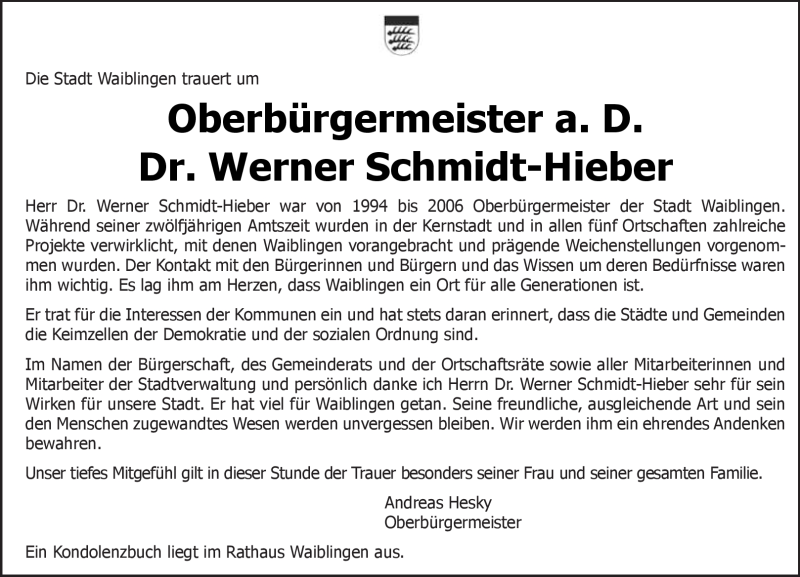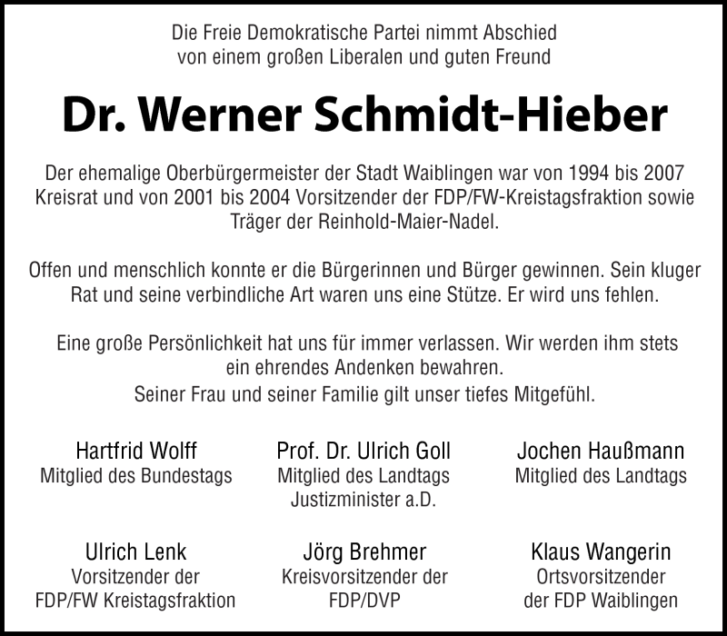 Hier finden Sie alle Traueranzeigen aus der Zeitung, die bisher für Werner Schmidt-Hieber erschienen sind. Weitere Traueranzeigen, die in der Zeitung erscheinen, werden hier ebenfalls aufgelistet