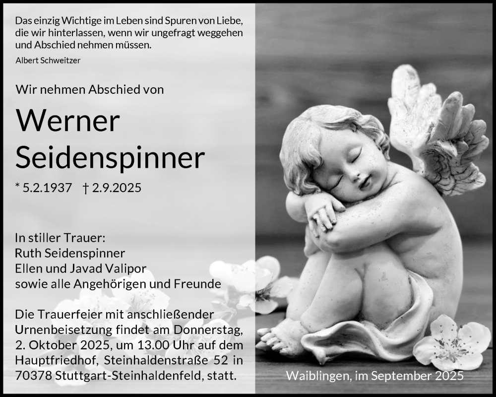 Hier finden Sie alle Traueranzeigen aus der Zeitung, die bisher für Werner Seidenspinner erschienen sind. Weitere Traueranzeigen, die in der Zeitung erscheinen, werden hier ebenfalls aufgelistet