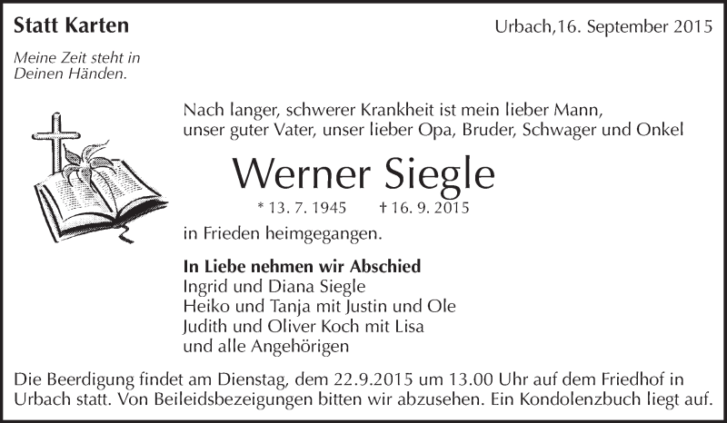 Hier finden Sie alle Traueranzeigen aus der Zeitung, die bisher für Werner Siegle erschienen sind. Weitere Traueranzeigen, die in der Zeitung erscheinen, werden hier ebenfalls aufgelistet