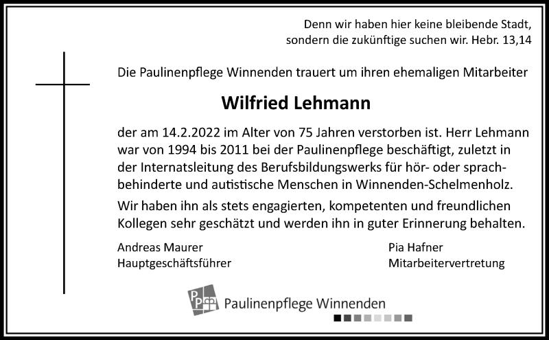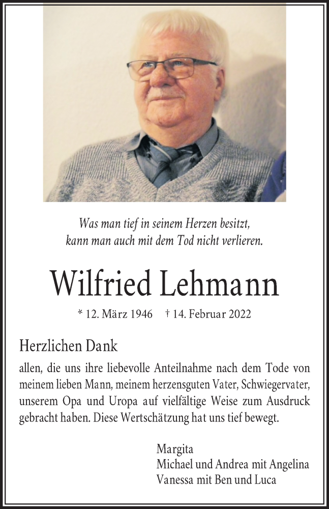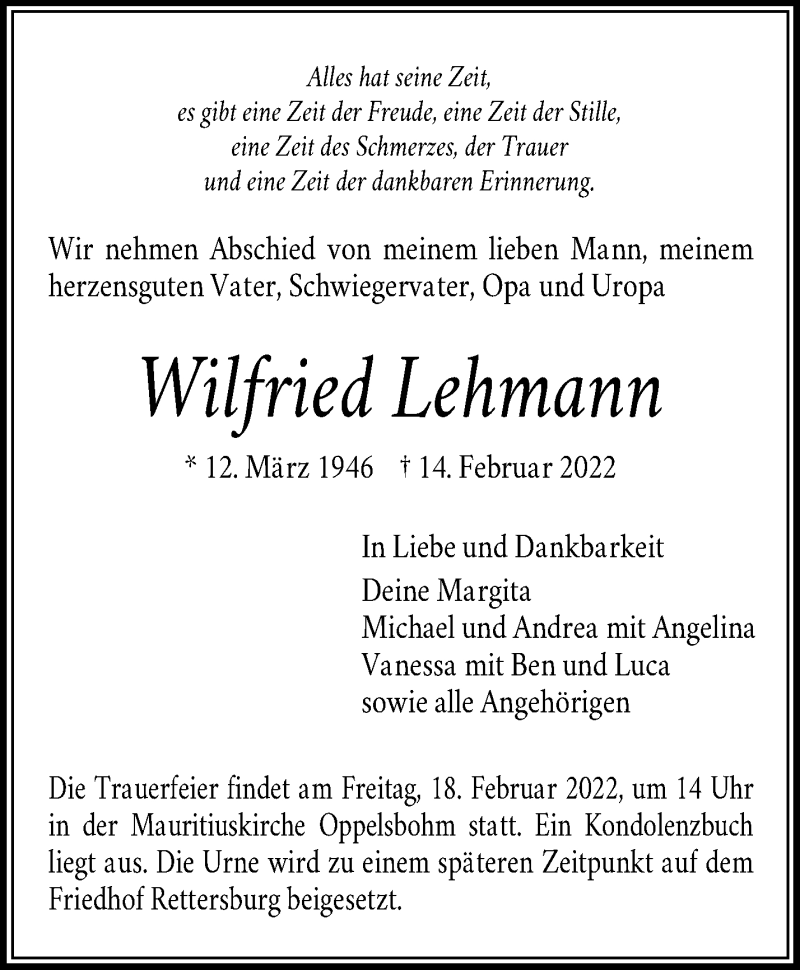 Hier finden Sie alle Traueranzeigen aus der Zeitung, die bisher für Wilfried Lehmann erschienen sind. Weitere Traueranzeigen, die in der Zeitung erscheinen, werden hier ebenfalls aufgelistet