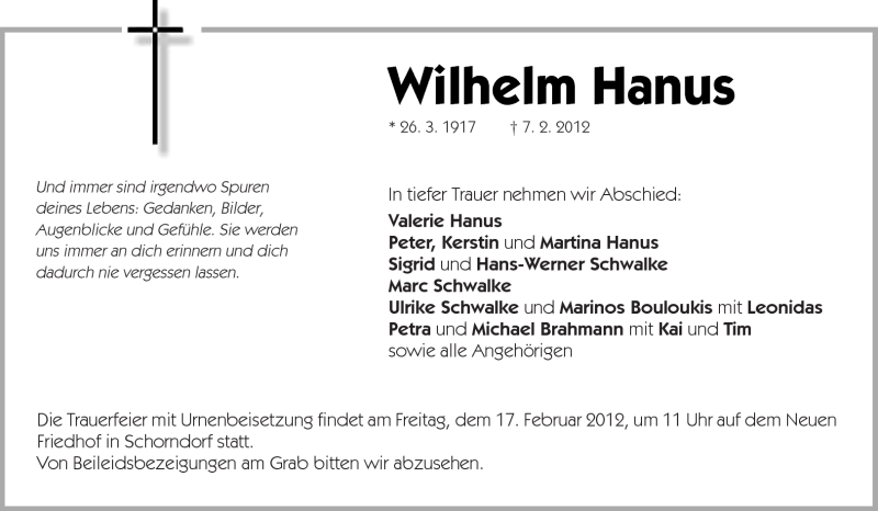 Hier finden Sie alle Traueranzeigen aus der Zeitung, die bisher für Wilhelm Hanus erschienen sind. Weitere Traueranzeigen, die in der Zeitung erscheinen, werden hier ebenfalls aufgelistet