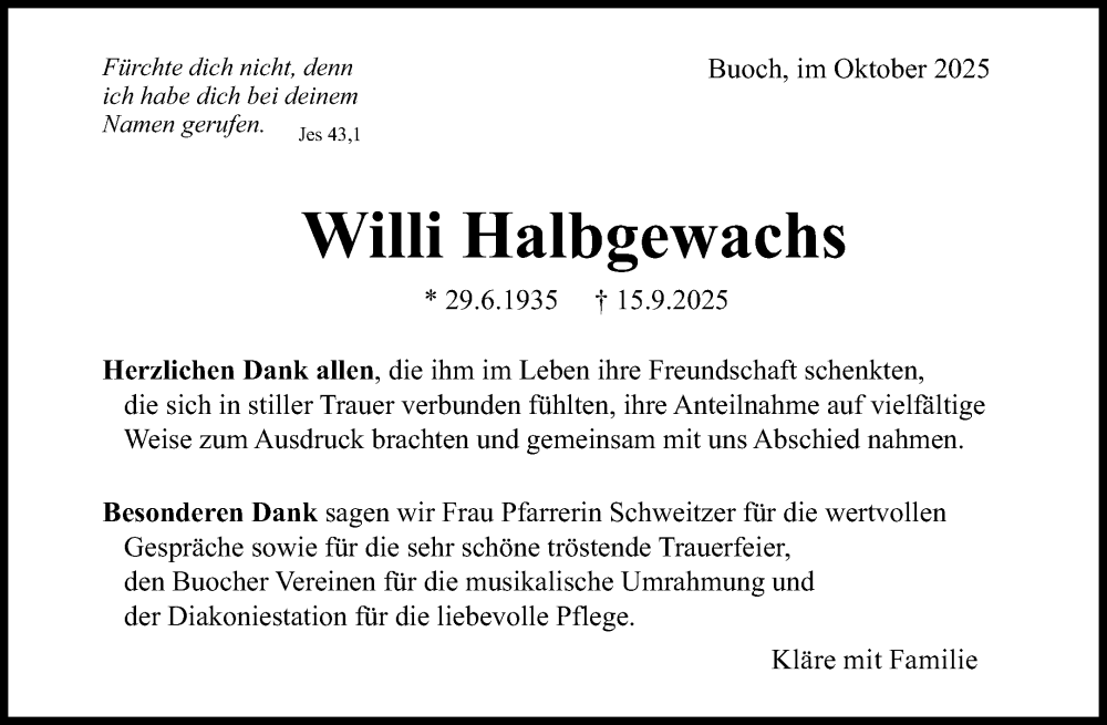 Hier finden Sie alle Traueranzeigen aus der Zeitung, die bisher für Willi Halbgewachs erschienen sind. Weitere Traueranzeigen, die in der Zeitung erscheinen, werden hier ebenfalls aufgelistet